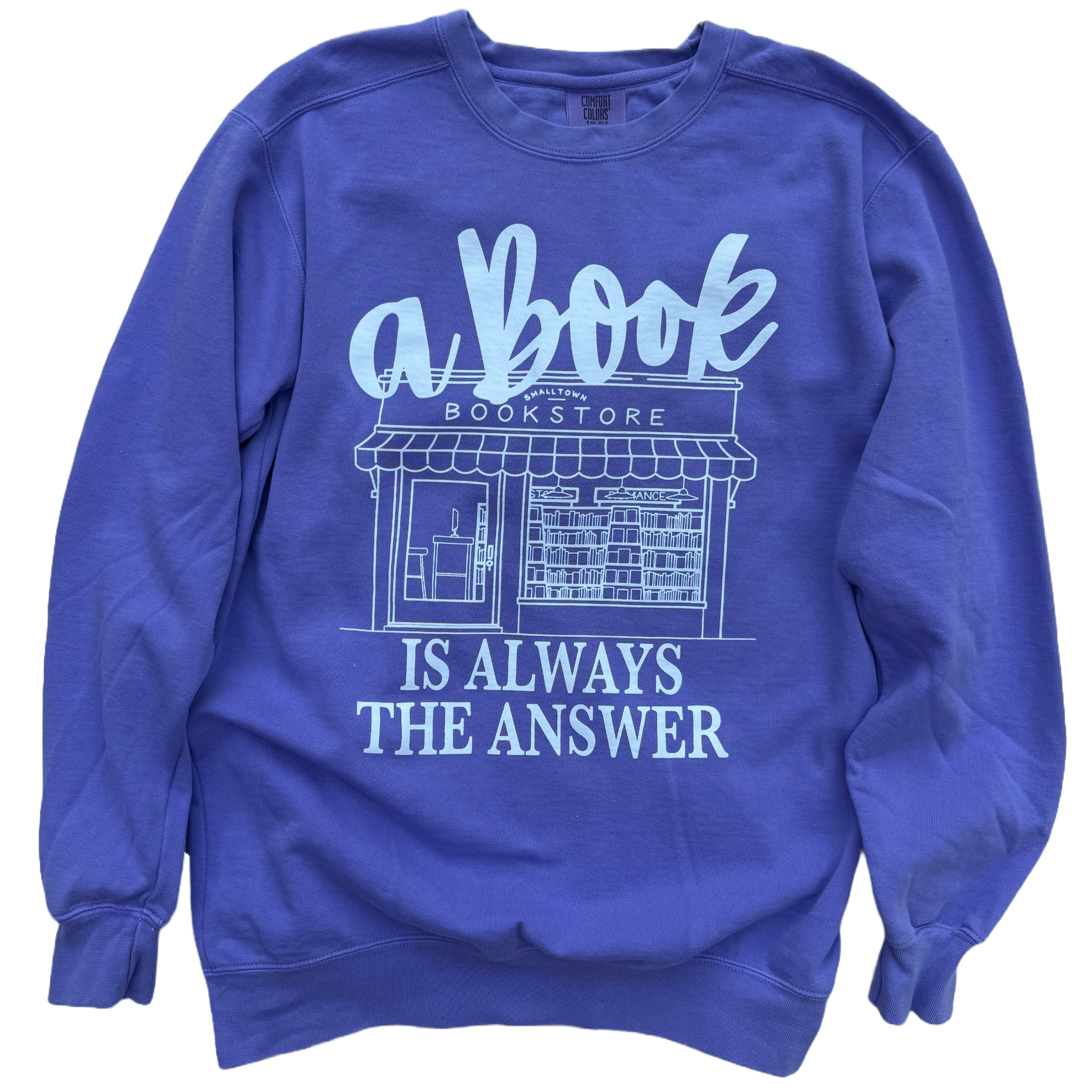 A Book is Always the Answer on the front of this violet sweatshirt in white ink.
