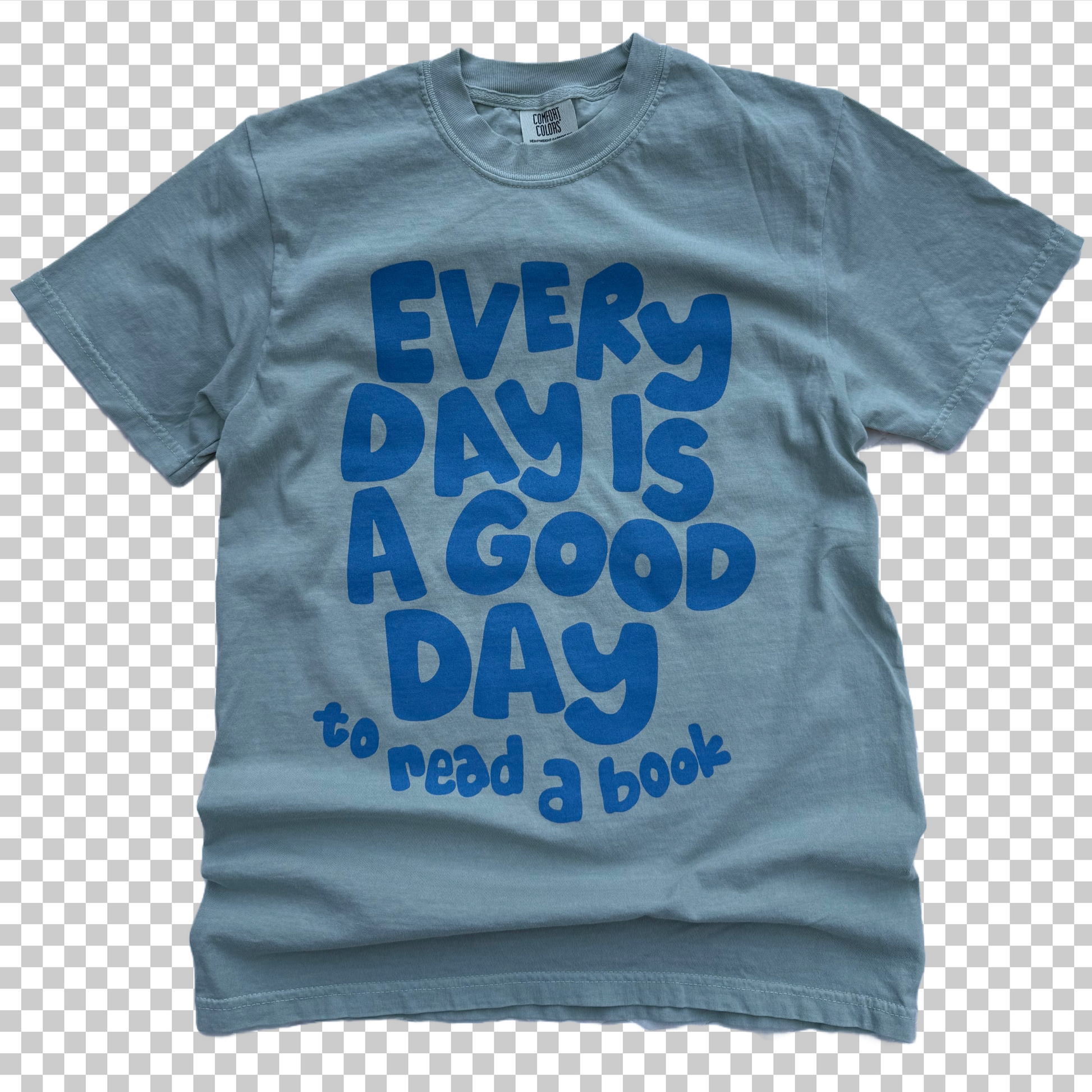 Every Day is a Good Day to Read a Book on the front of this light green colored t-shirt in blue ink.