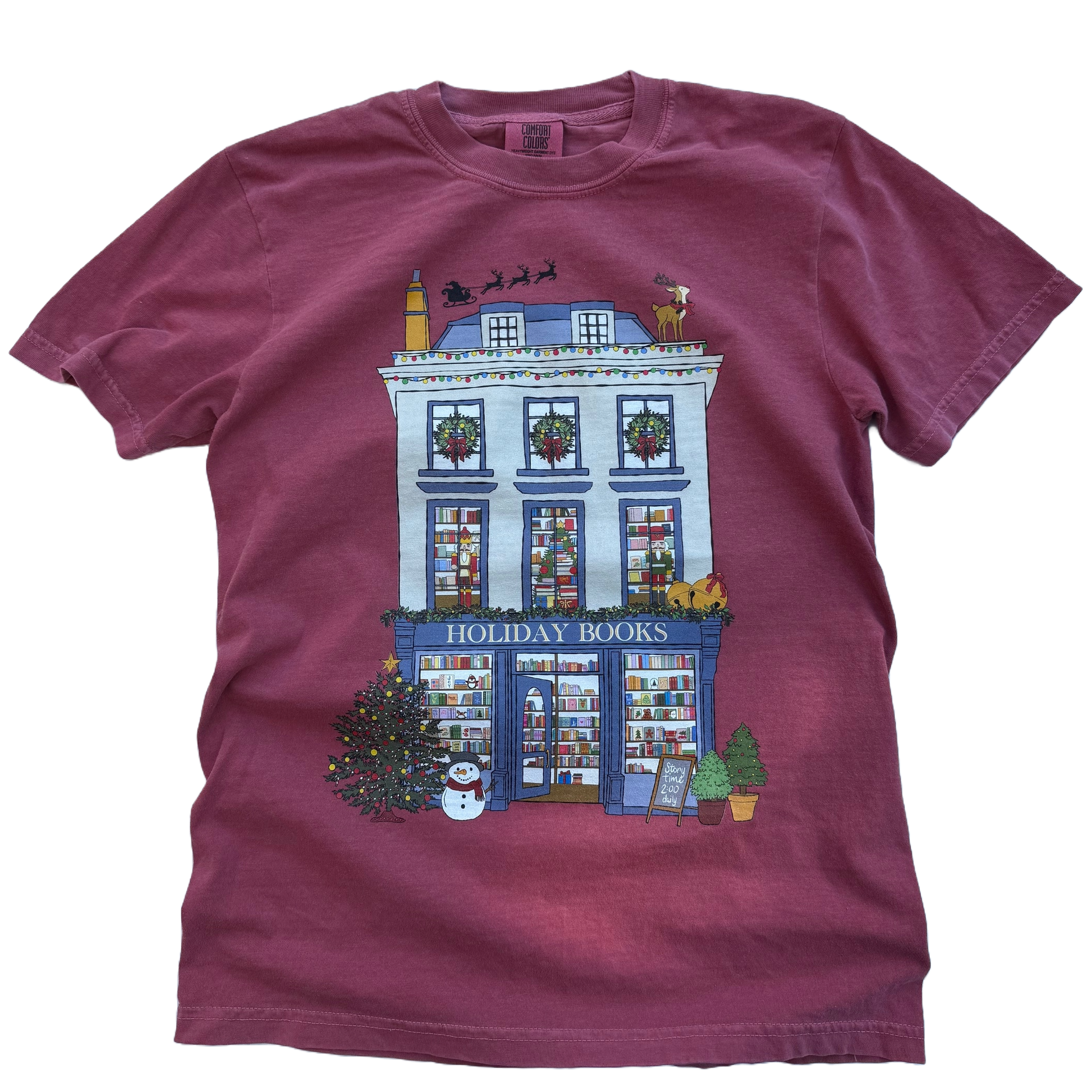The Holiday Books shop is ready for the holidays and printed on a crimson tee.