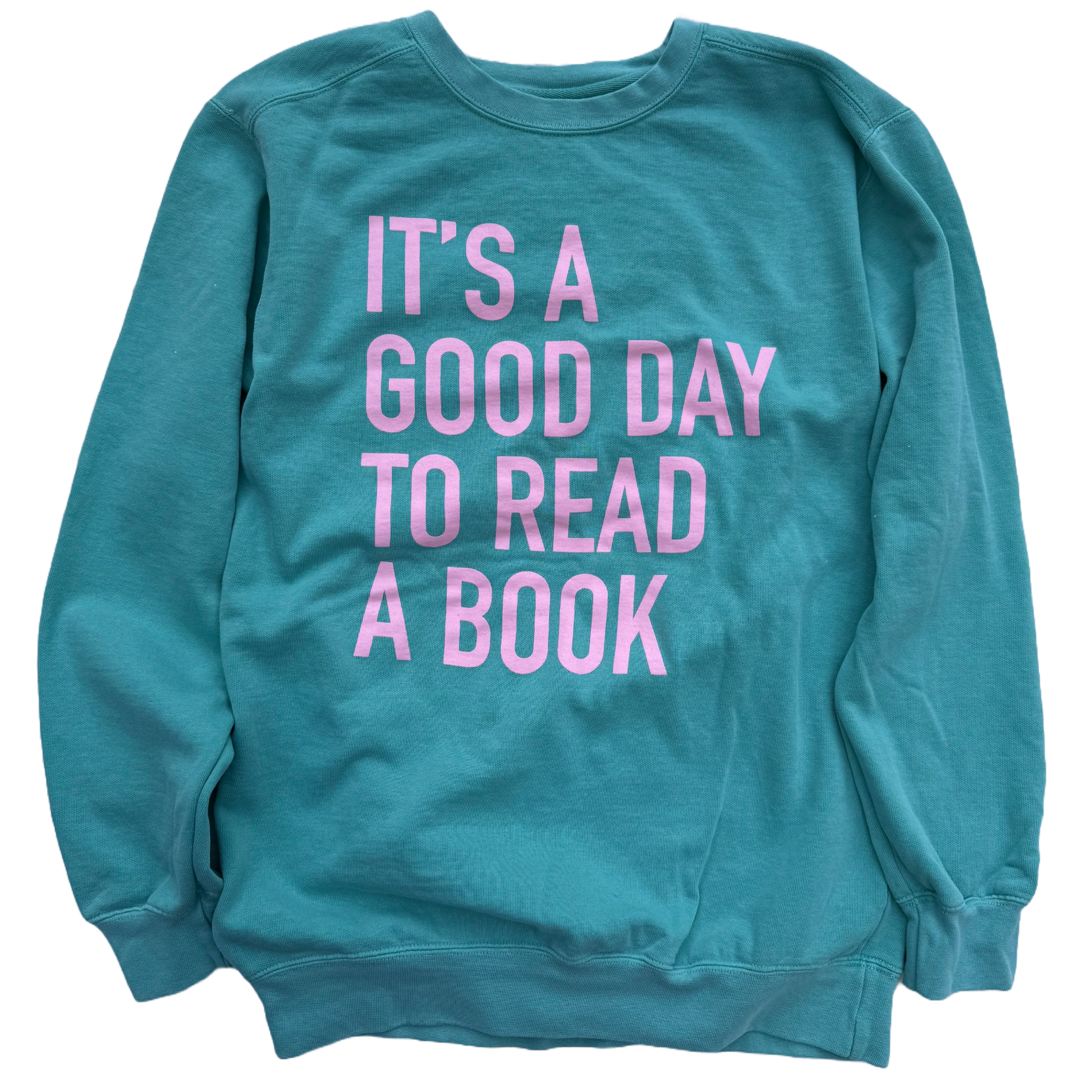 IT'S A GOOD DAY TO READ A BOOK on the front of this seafoam green sweatshirt in light pink ink.