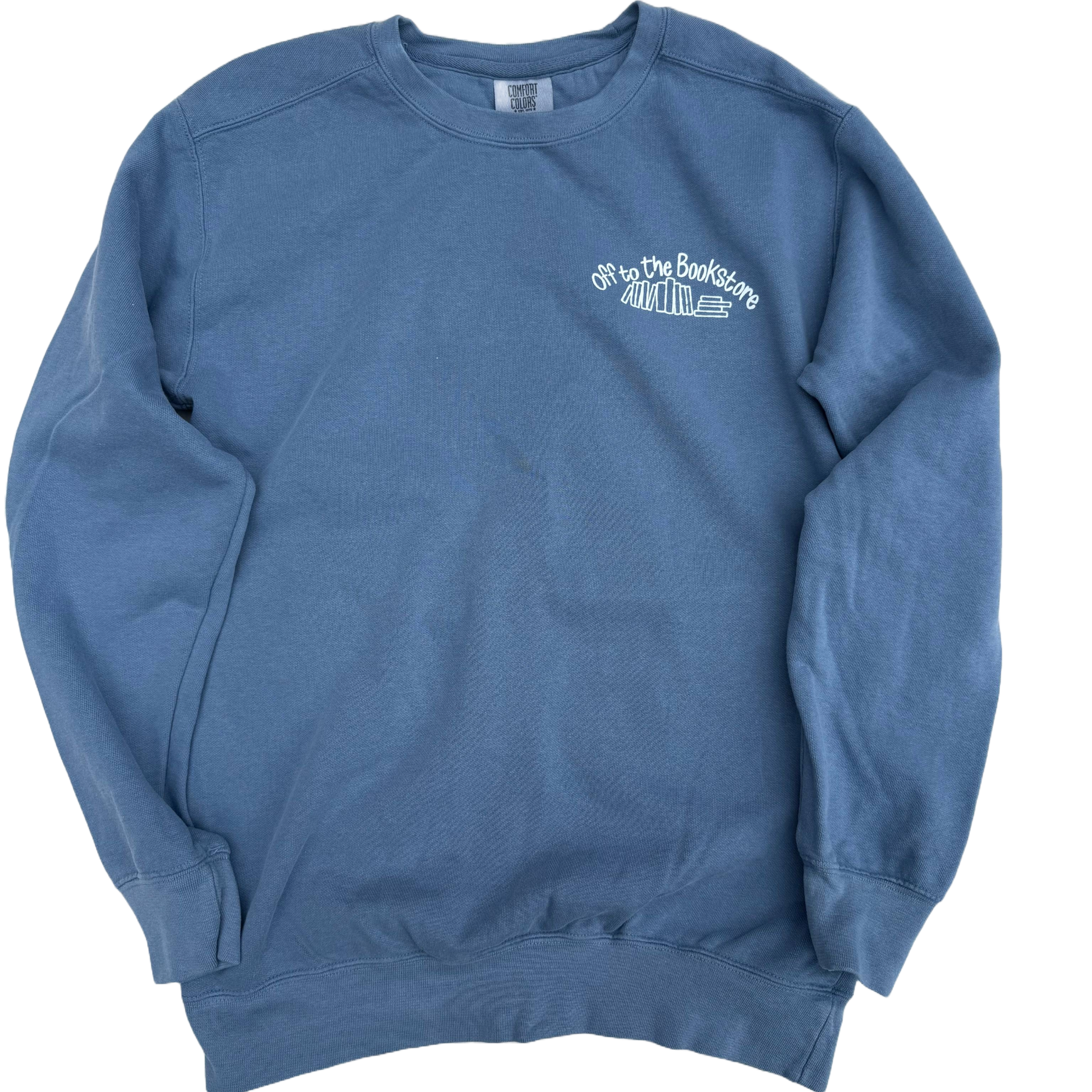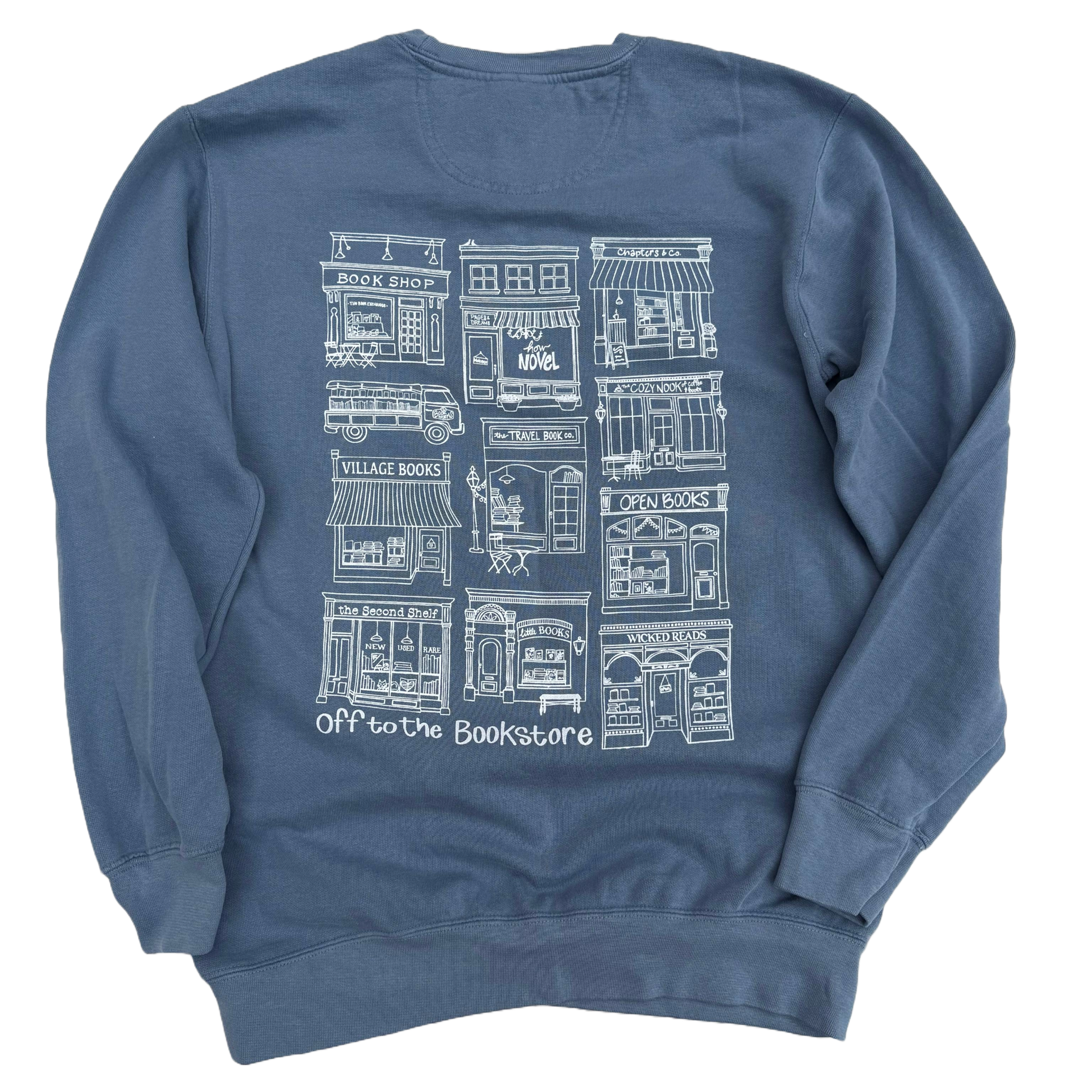 Off to the Bookstore on the front and back of this blue jean blue sweatshirt in white ink with dreamy bookshops printed on the back.