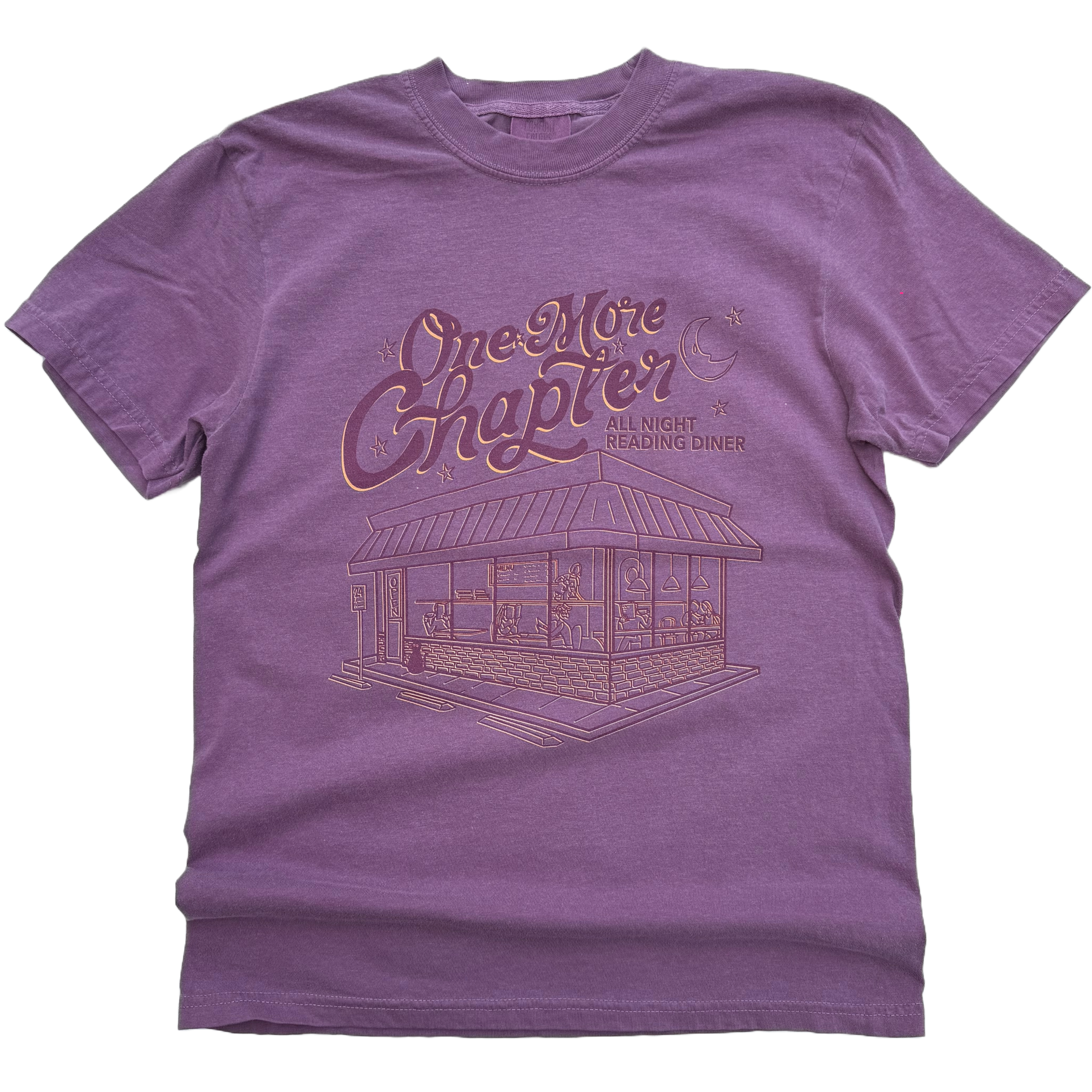 One More Chapter All Night Reading Diner fun tee on a berry colored short sleeve tee. This tee is for those that know a good book can and will keep you up at night and the all night diner is there waiting for you.