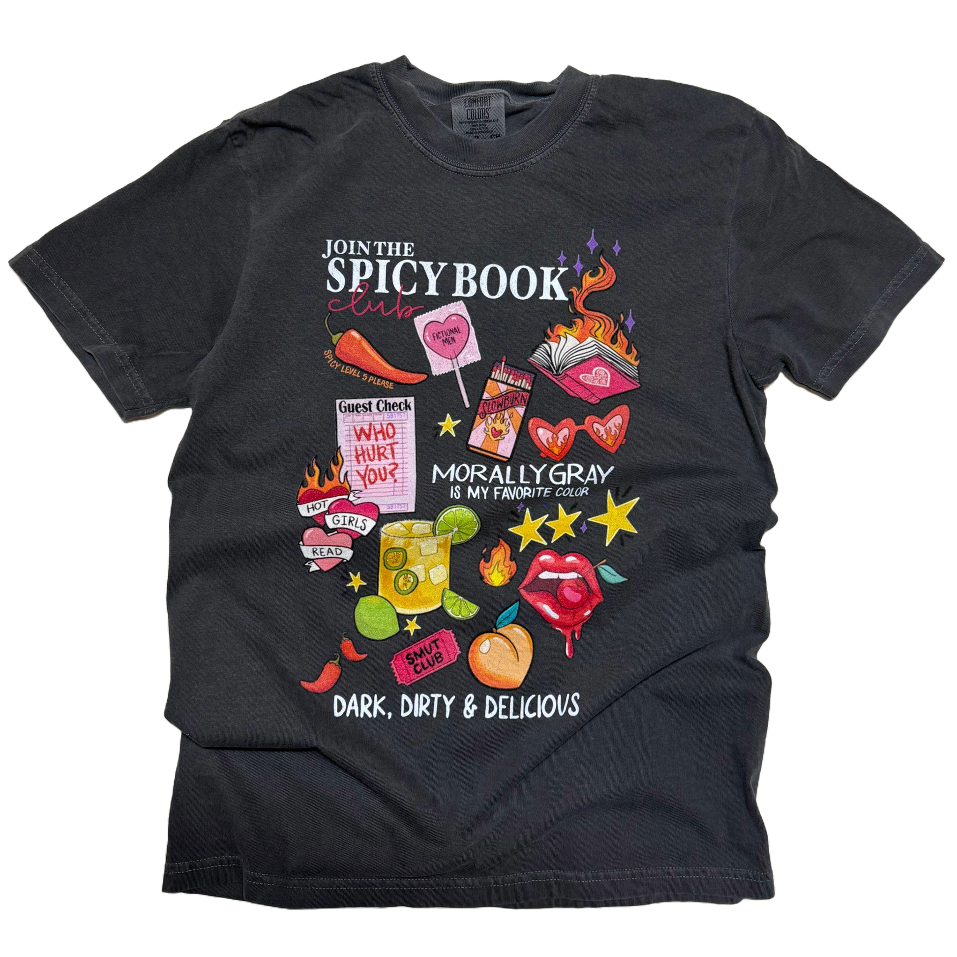 The Spicy Book Club fun tee on a dark gray (pepper) short sleeve tee. This tee is for those that love a spicy read. Featuring on the front: Morally Gray is my favorite color, Dark, Dirty & Delicious, Hot Girls Read, Who Hurt You?, Slow burn matches, and more!